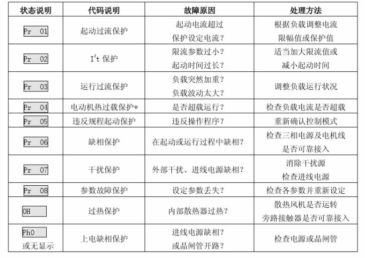 STR软起动器有10种故障保护功能,当软起动器故障保护功能动作时,软起动器立即停机,操作键盘显示故障保护代码,用户可根据代码所对应的故障原因进行分析处理。在故障排除后,可通过复位键RESET进行复位。使软起动器回到起动准备状态。